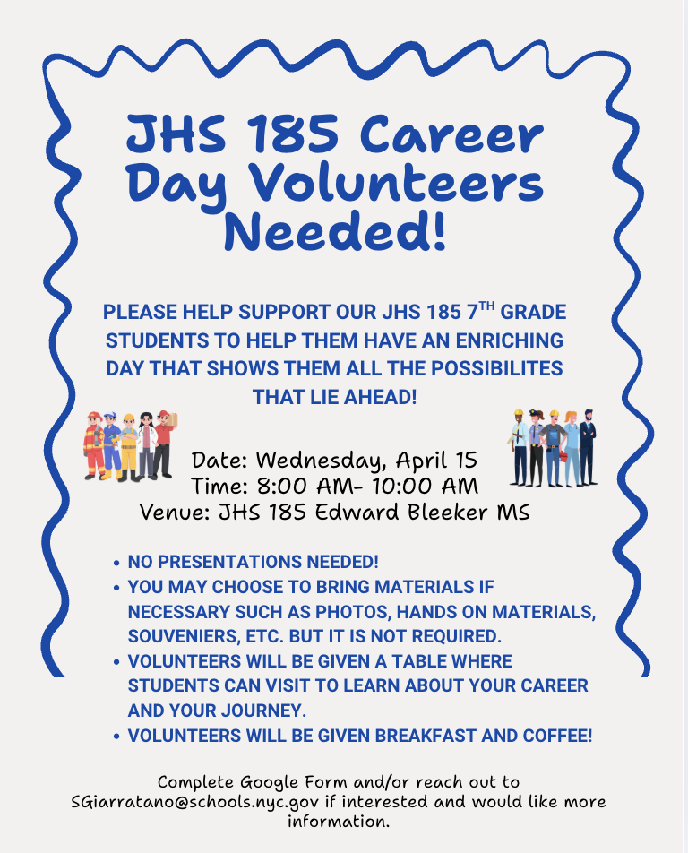 We are looking for volunteers for our Career Day which will be on 4/15 for our 7th grade students. Below is a flyer with more information. Please consider signing up to help ensure our day is successful for our 7th grade students! We want to show them all the opportunities that lie ahead.