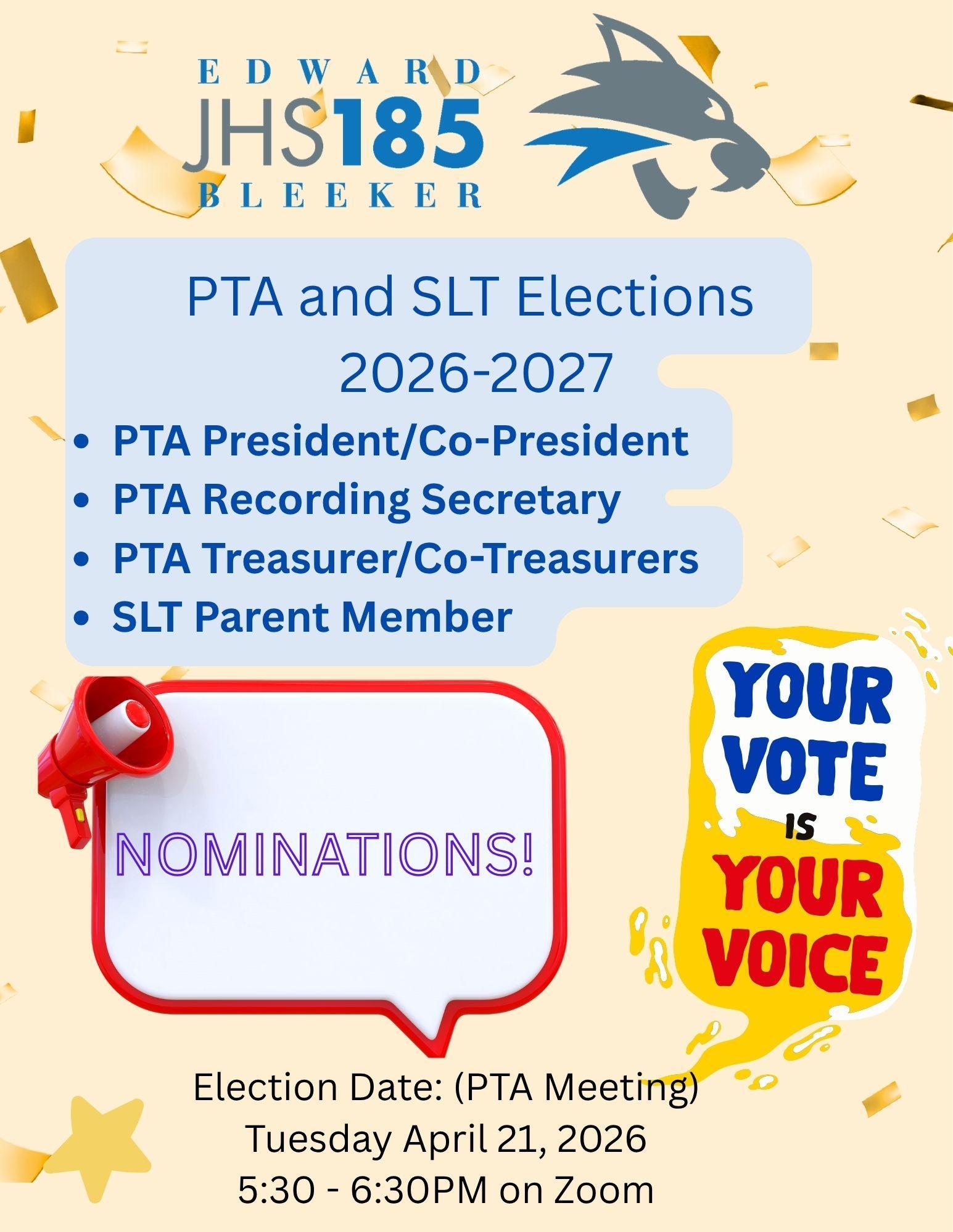 We are also looking to fill One (1) parent positions to sit on the SLT (School Leadership Team). The position is 2 year terms beginning 9/1/2026 through 6/30/2028. If you are interested in this position, please complete the form below. If you should have any questions or would like to nominate someone, please feel free to contact the PTA at PTA[email protected]. Please find the description of each position below.